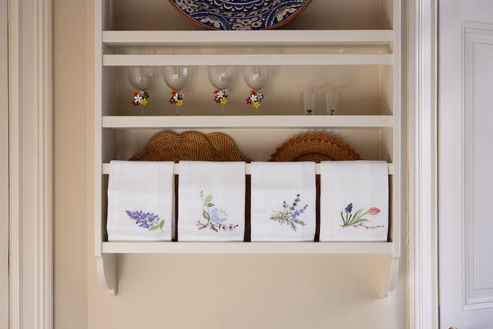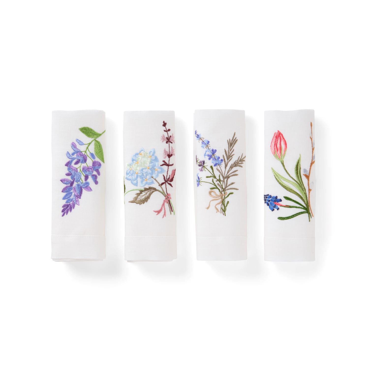 Say hello to our summer collection with the most dreamy embroidered summer flowers. This stunning gift set includes four napkins with different embroideries: Hydrangea, Lavender, Tulip, and Wisteria. It's the perfect gift box for anyone who loves table settings and interior design, whether for Mother's Day, midsummer, or weddings. Each napkin is consciously handmade and embroidered in white premium Italian linen, featuring elegant stitching on the border. With generous sizing, they're perfect for adding an elegant touch to your summer table.