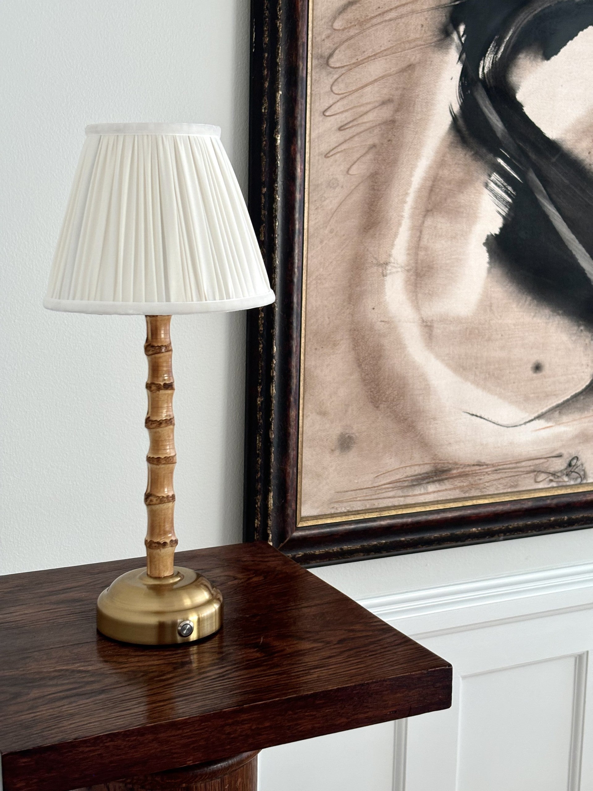 Ilumina tu espacio con elegancia y calidez con nuestra lámpara de mesa recargable, elaborada en bambú y con una pantalla bellamente detallada.